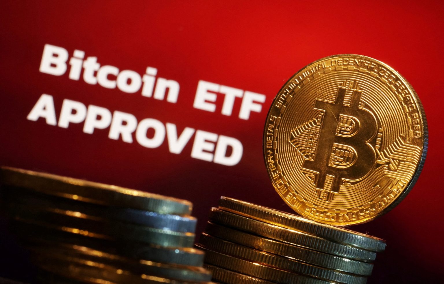 FILE PHOTO: Representation of Bitcoin cryptocurrency and "Bitcoin ETF Approved" words are seen in this illustration taken January 11, 2024. REUTERS/Dado Ruvic/Illustration/File Photo